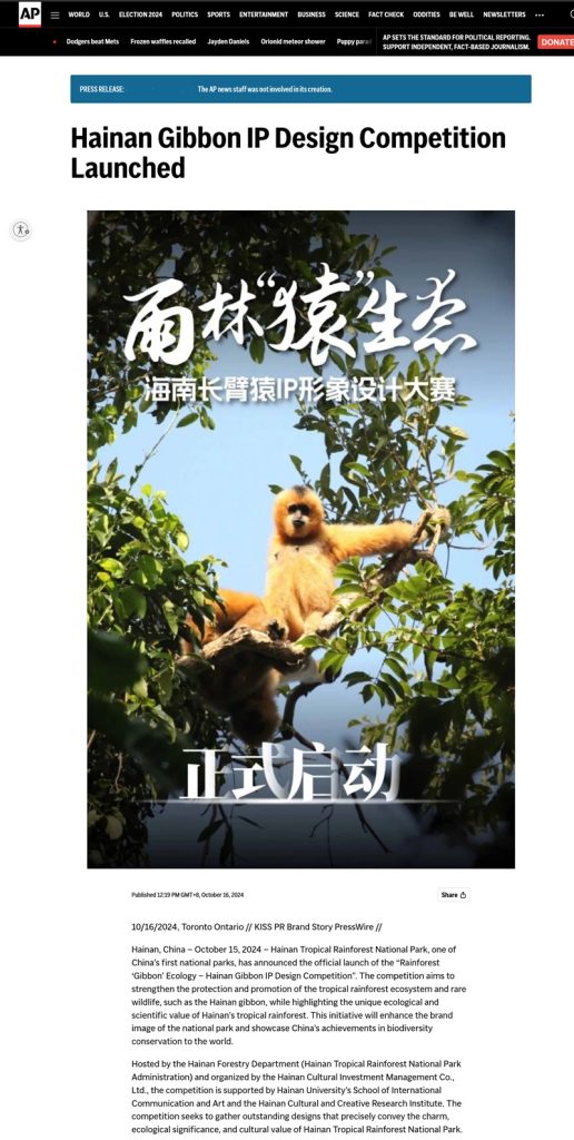 美联社等近200家中外文媒体报道“海南长臂猿IP形象设计大赛”