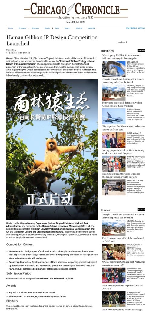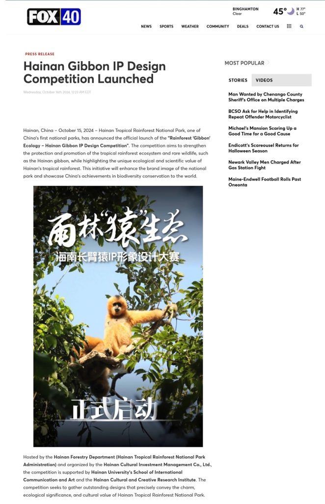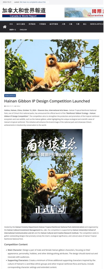 世界著名通讯社美联社(Associated Press)、美国《数码日报》(Digital Journal)、《芝加哥纪事报》(Chicago Chronicle)、《加拿大和世界报道》(Canada & World Report)和全美国71家广播电视台以及其它65家美国媒体以 “Hainan Gibbon IP Design Competition Launched” (海南长臂猿IP设计大赛启动)为标题对本次大赛进行报道或转载。