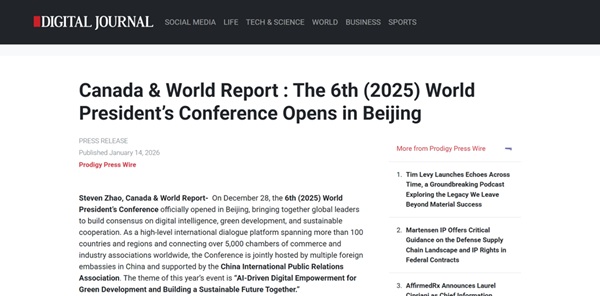 在众多英文媒体中,来自加拿大的 Digital Journal(《数码日报》) 成为本届大会国际传播的重要源头媒体之一。该媒体成立于1998年,总部位于多伦多,是加拿大具有国际影响力的数字新闻平台,长期关注全球商业、国际事务、科技创新与跨文化交流,读者遍布北美、欧洲及亚太地区。其对第六届世界会长大会的报道,将大会置于“国际合作与发展”的宏观背景之中,显著提升了大会在国际舆论场中的可见度。