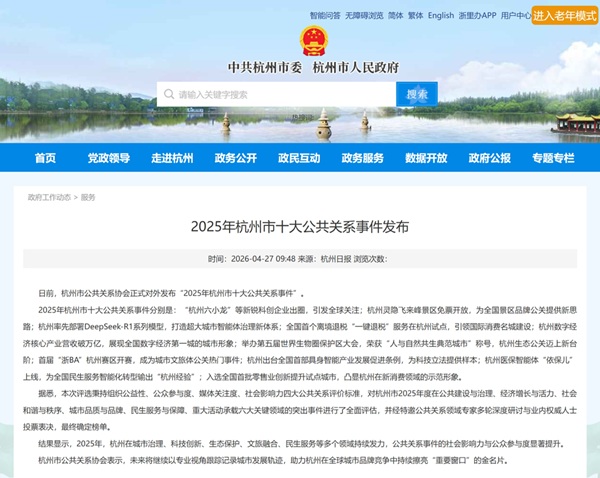 2026年4月,杭州市公共关系协会正式对外发布“2025年杭州市十大公共关系事件”。