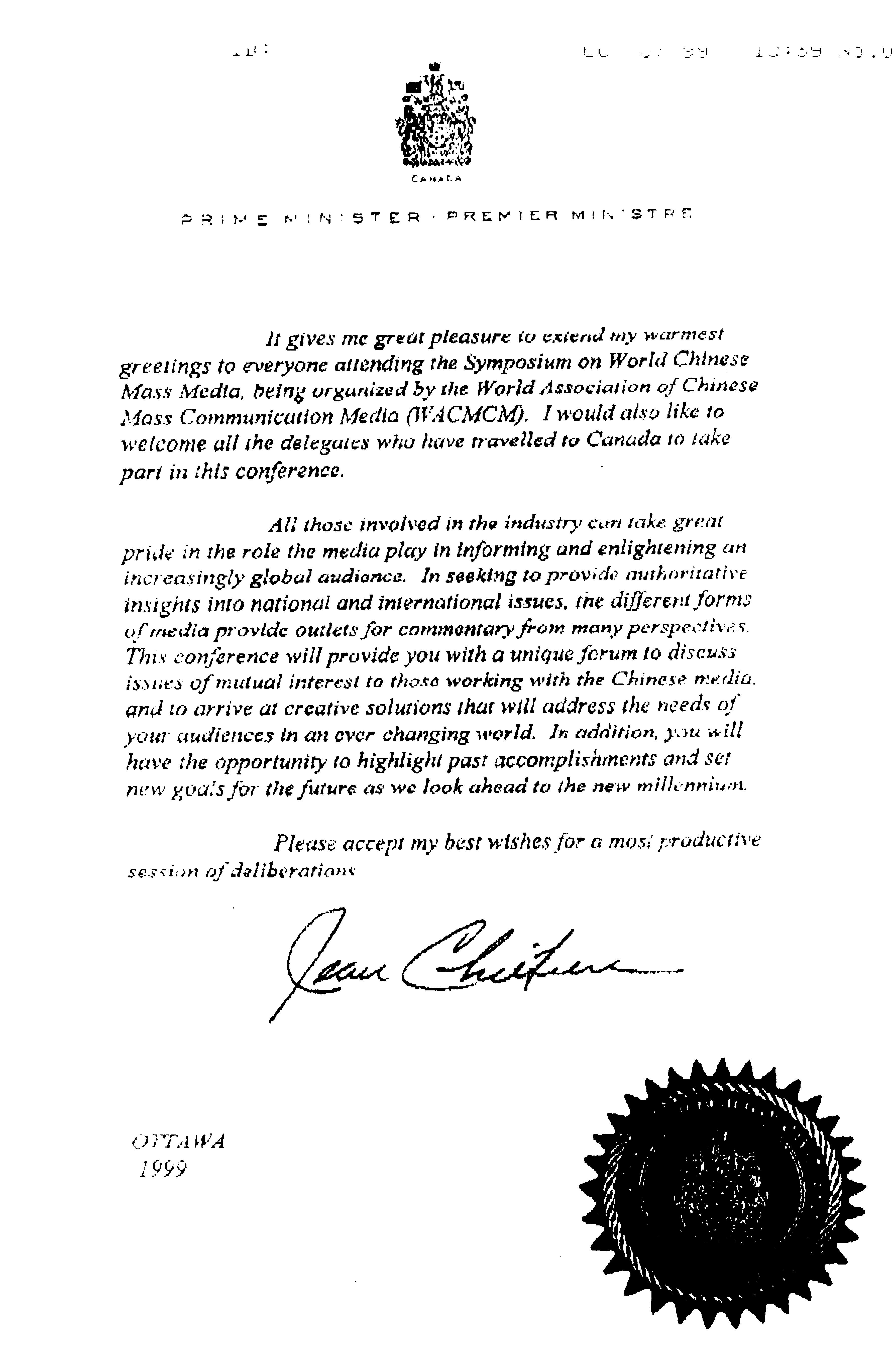加拿大总理克里蒂安传真祝贺协会成立暨第一届年会在多伦多召开 世界华文大众传播媒体协会第一届年会(加拿大多伦多) 世界华文大众传播媒体协会第二届年会(美国旧金山) 世界华文大众传播媒体协会第三届年会(加拿大、古巴)